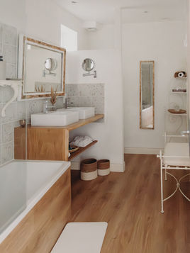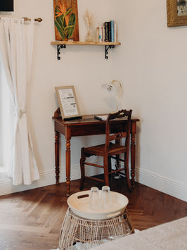 Cette Suite de 35 m2 en réez de chaussée constitue un véritable refuge de sérénité , son coin lecture , agrémenté d'un canapé douillet , incite a savouré des moments de tranquillités . Le lit de 160*200 garantie des nuits reposantes et la salle de bain avec baignoire offre un espace idéal pour se relaxer . Le décor doux et romantique installe une ambiance chaleureuse et apaisante .​